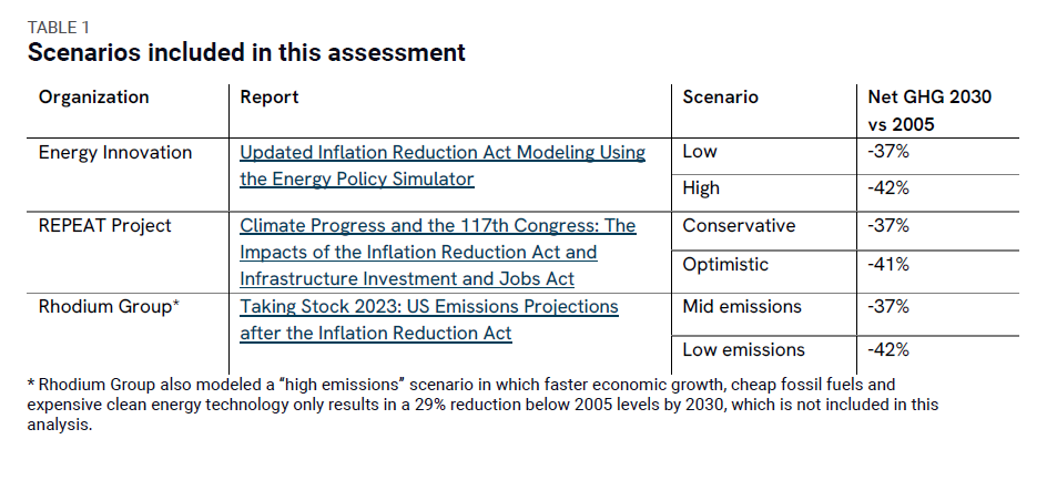 We compare actual progress in 2022 and 2023 in the CIM database to projections from three organizations whose assessments of the potential impact of the IRA and IIJA are widely used by policymakers and stakeholders: Energy Innovation (EI), the REPEAT Project at Princeton University, and Rhodium Group. All three groups modeled scenarios for IRA/IIJA implementation that found the possibility of a 37-42% reduction in US net GHG emissions by 2030 relative to 2005 levels (Table 1). This is broadly in line with the authors of the IRA’s stated objective of achieving a 40% reduction in emissions by 2030.