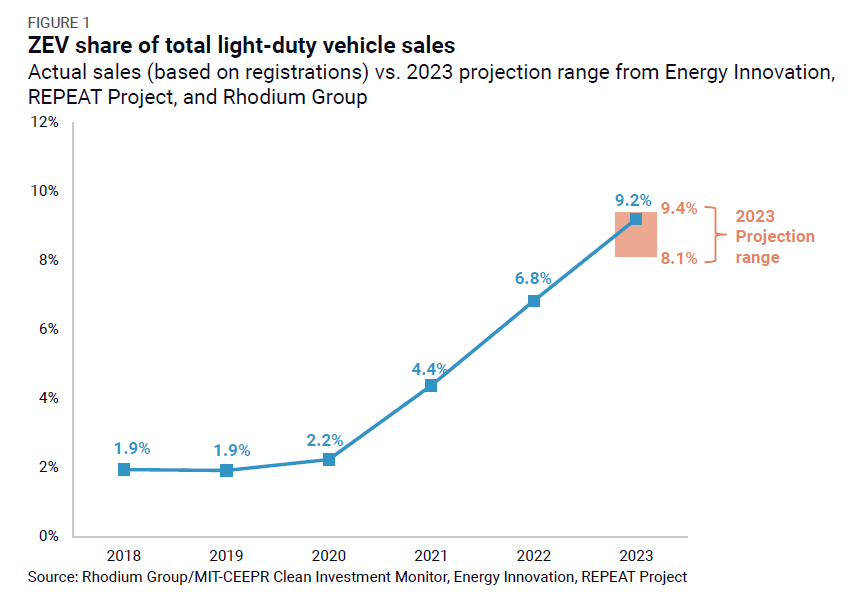 Over the past several months, there have been a number of news stories suggesting the US is experiencing a slow-down in electric vehicle sales, but sales in 2023 came in at the top end of the range of post-IRA projections. Based on preliminary 2023 CIM data, we estimate that 1.43 million ZEVs were sold in the US in 2023, the vast majority of which were battery electric vehicles. These sales account for 9.2% of total light-duty vehicle sales last year, up from 6.8% in 2022 and 2.2% in 2020 (Figure 1). Post-IRA analysis from EI, REPEAT, and Rhodium projected an 8.1% to 9.4% ZEV sales share in 2023. While actual sales came in at the top end of the range of post-IRA projections, they dramatically exceeded projections from a few years ago. In 2020, for example, the Energy Information Administration projected 580,000 ZEV sales in 2023—a little more than one-third of the actual total last year.