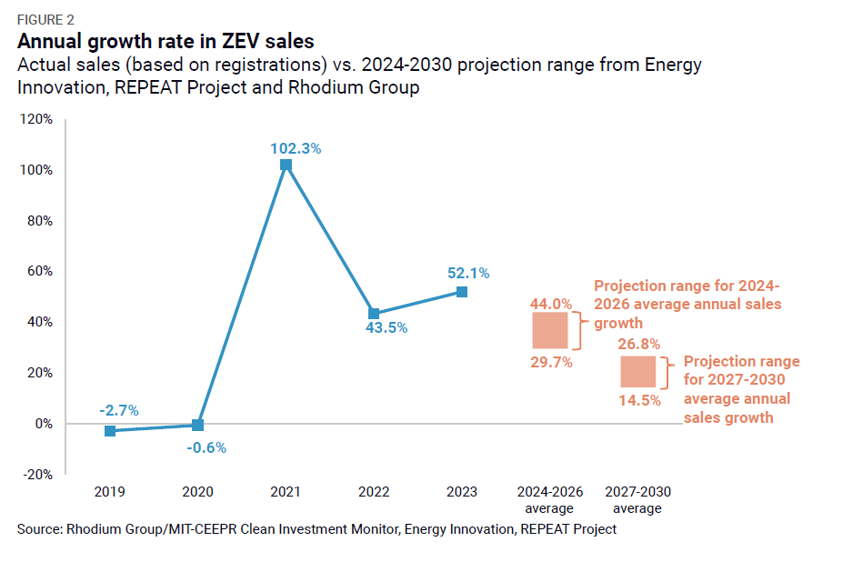 It is likely, based on Q4 growth rates, dealer inventory levels, and forward guidance from Tesla last month, that annual ZEV sales growth will fall in 2024 from the more than 50% growth experienced in 2023. But sustained 50% year-over-year sales growth was neither expected to occur as a result of the IRA, nor is it required to achieve the legislation’s goal of a 40% reduction in net GHG emissions by 2030. Indeed, the projections from EI, REPEAT, and Rhodium include between a 30% and 44% average annual growth in ZEV sales between 2024 and 2026, slowing further to 15% and 27% between 2027 and 2030 (Figure 2).