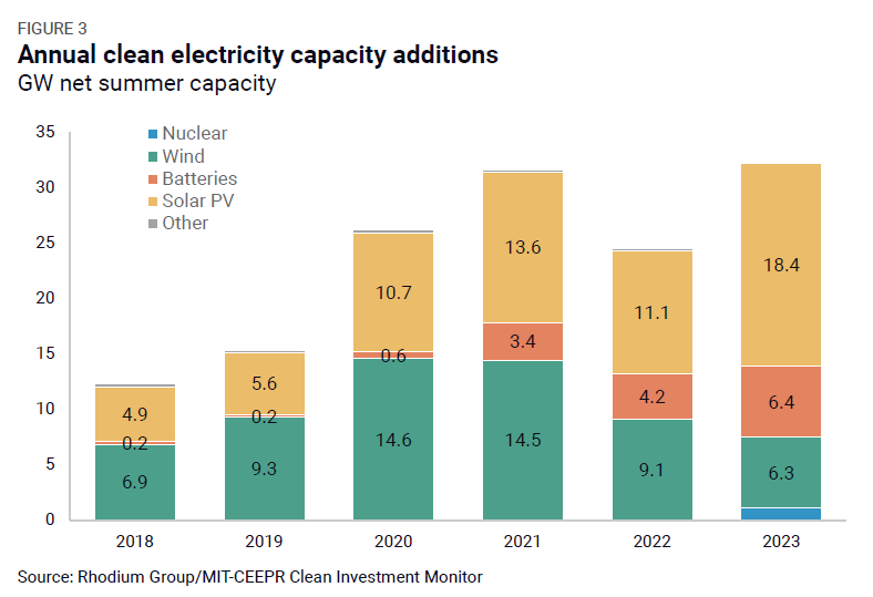 While ZEV sales exceeded post-IRA projections in 2023,utility-scale clean electricity expansion is falling short. There was a record 32.3GW of zero-carbon electricity generation and storage capacity added to the grid in 2023, up 32% from 2022 and topping the previous high of 31.6 GW in 2021 (Figure 3). The majority of new capacity was solar PV at 18.4 GW, followed by battery storage at 6.4 GW and wind at 6.3 GW.
