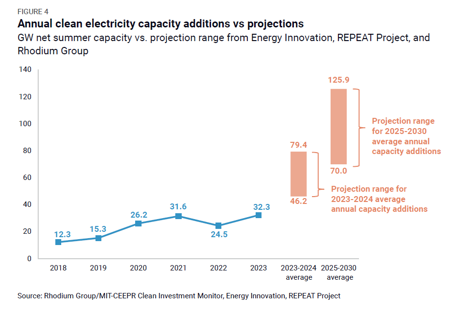 Beyond 2024, the pace of annual capacity additions consistent with modeled pathways to a 40% reduction in net GHG emissions by 2030 only increases. Post-IRA projections from the three organizations included in this survey have average annual capacity additions between 2025 and 2030 ranging from 70 GW to 126 GW.