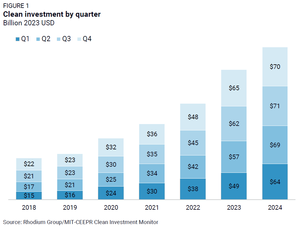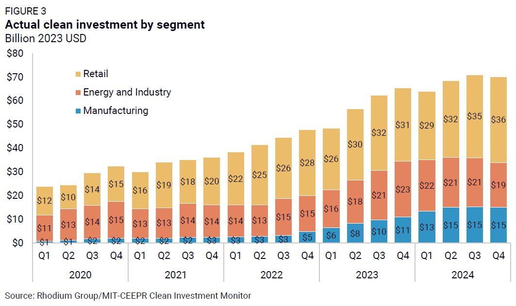 Consumer purchases and installations of $36 billion of clean technology, tracked in our retail segment, were the primary drivers of investment. Retail investment grew by 4% relative to the previous quarter, while investments in manufacturing projects, utility-scale clean electricity, and industrial decarbonization technologies experienced quarter-on-quarter declines. Relative to the same quarter in 2023, retail investment increased by 15% and manufacturing investment was up a notable 37%, while clean energy and industrial investments fell by 20%.