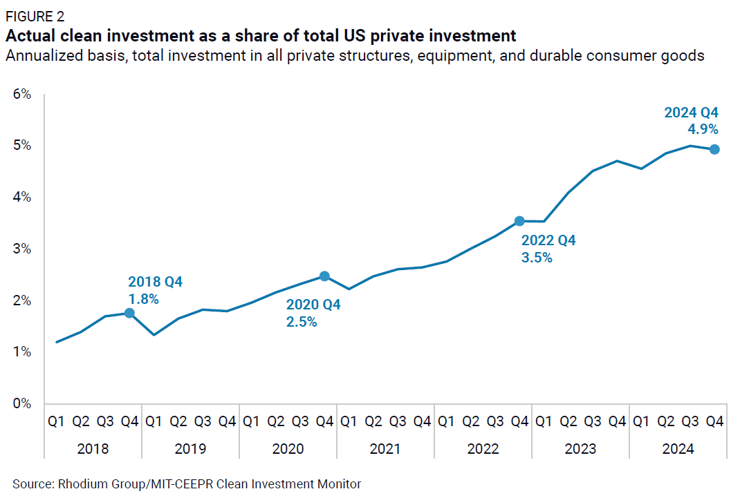 Actual clean energy and transportation investment in the US in Q4 2024 totaled $70 billion, a 1% decrease from the previous quarter (Figure 1). While this marks a 6% increase from the same period in 2023, it's a deceleration and a departure from the nearly unbroken streak of quarter-on-quarter growth. This brings total clean investment in 2024 to $272 billion, a 16% increase from 2023. In Q4 2024, clean investment accounted for 4.9% of total US private investment in structures, equipment, and durable consumer goods nationwide, down slightly from 5% in Q3 2024 but still up from 4.7% in Q4 2023 (Figure 2).
