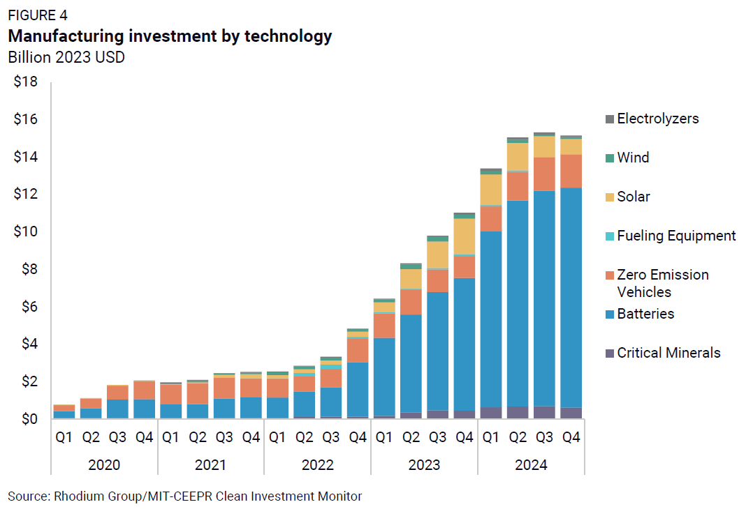 The electric vehicle (EV) supply chain—critical minerals, batteries, vehicle assembly, and charging equipment—continued to dominate clean manufacturing investment in Q4, at $14 billion (93%) of the total $15 billion in actual investment (Figure 4). Investment in the EV supply chain was up 79% in 2024 relative to 2023, reflecting sustained momentum in the sector. Battery manufacturing investment increased by 2% quarter-on-quarter to $12 billion, marking a 91% year-over-year increase from 2023. Solar manufacturing investment decreased by 24% quarter-on-quarter from $1.2 billion in Q3 2024 to $935 million in Q4 2024. Despite four quarters of consistent decline, solar manufacturing investment in 2024 as a whole was 8% higher at $5.5 billion than the $5.1 billion invested in 2023.