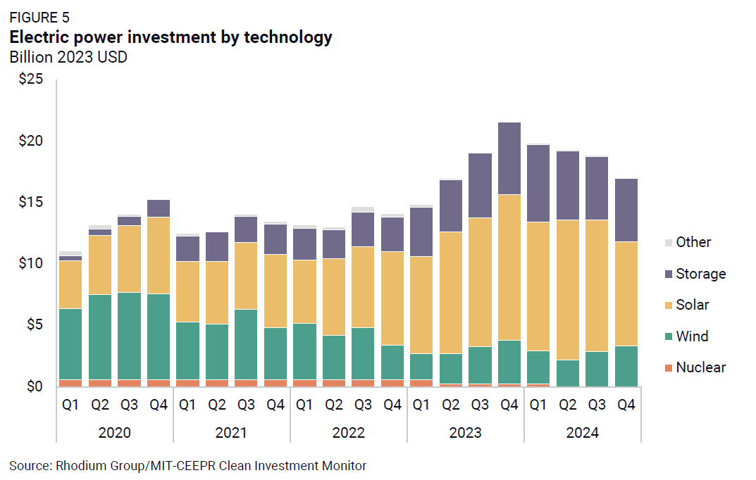 The last quarter of 2024 saw a total of $19 billion in new actual investment in clean energy production and industrial decarbonization, down 9% quarter-on-quarter and down 20% relative to the same period in 2023. Within this segment, 90% of actual investment went toward clean electricity, while the remaining 10% supported industrial decarbonization projects, a distribution consistent with previous quarters. Utility-scale solar and storage investment accounted for the majority of clean electricity investment in Q4 at $14 billion, but both of these technologies recorded declines in Q4 relative to both Q3 2024 and Q4 2023 (Figure 5). Utility-scale solar investment fell by 21% in Q4, while grid-scale storage investment remained relatively flat quarter-on-quarter. Wind investment recorded a third consecutive quarterly increase, up by 16% quarter-on-quarter to $3.3 billion in Q4.