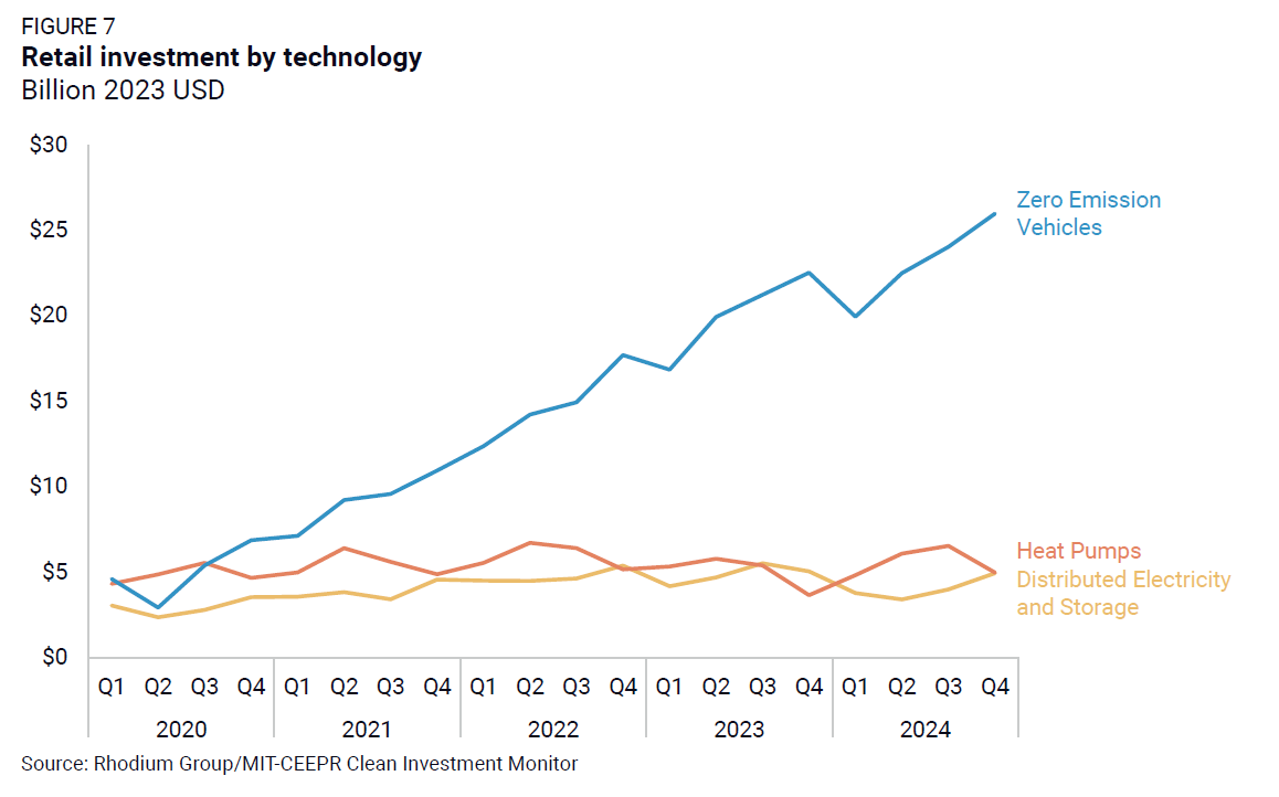 Consumer purchases of zero-emission vehicles (ZEVs), distributed renewable electricity and storage, and heat pumps came in at $36 billion in Q4 2024, up 4% from Q3 2024. Full-year 2024 retail investment reached $131 billion, up 9% from $120 billion in 2023.