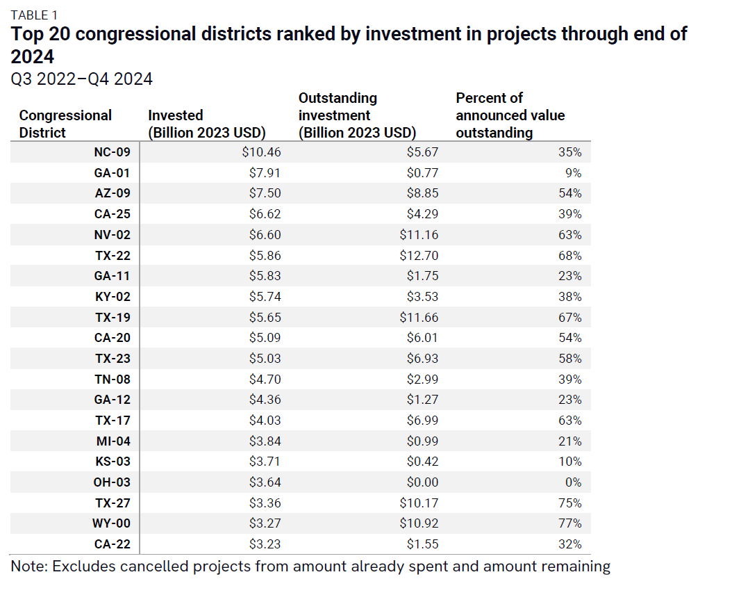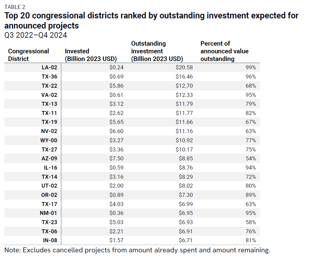 Table 1 presents the top 20 congressional districts ranked by the amount invested so far, while Table 2 ranks the top 20 congressional districts by amount of outstanding investment expected for announced projects. The full dataset with all congressional districts and project counts is available at this link.